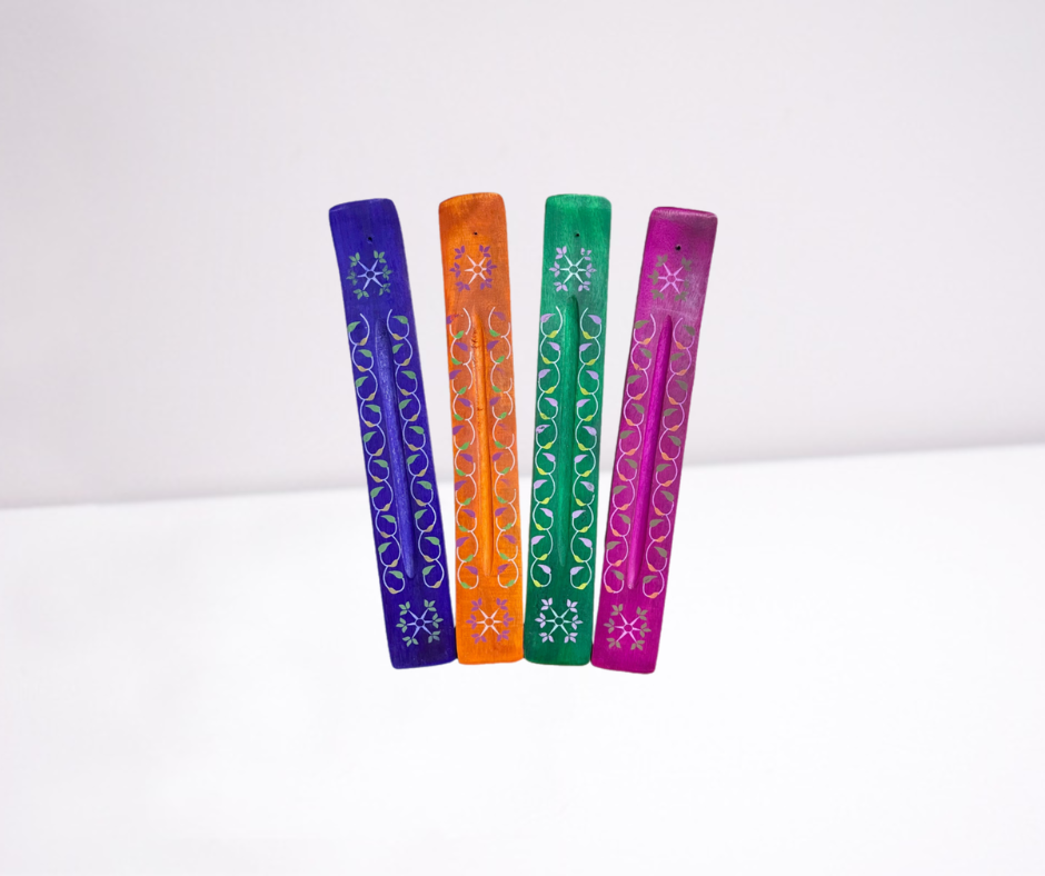 A simple yet elegant way to catch ash from your favorite incense. This wooden incense holder features a delicate vine design and a soothing purple finish. Ideal for creating a tranquil corner in your space.